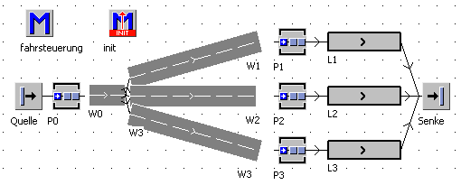 ein Roboter nimmt an einer Stelle Teile auf und verteilt diese auf drei Maschinen