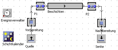 Simuliert werden soll ein kontinuierlicher Prozess (Beschichtung), der einen Arbeitsplatz Vorbereitung und einen Arbeitsplatz Nachbereitung besitzt. Die Beschichtung arbeitet 24 h am Tag, sieben Tage in der Woche, Vor- und Nachbearbeitung arbeiten nach einem Schichtregime.
