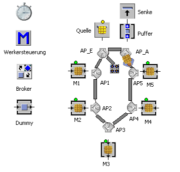 Das Beispiel zeigt eine Chaku-Chaku-Simulation ohne Zwischenpuffer. Der Werker entlädt und lädt Maschinen direkt.