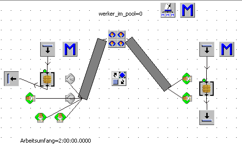 Es wird die Anzahl der verfügbaren Werker ermittelt, diese Anzahl Werker angefordert und die Bearbeitungszeit der Arbeitsstation angepasst.