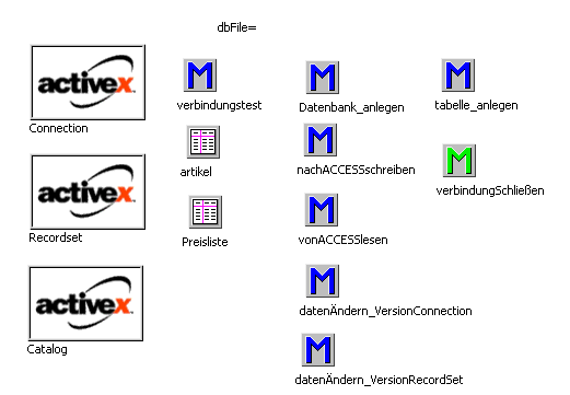Zeigt die Arbeit mit ADO: Datenbanken erzeugen, Tabellen anlegen, Daten eintragen, Daten suchen und anzeigen, Daten ändern