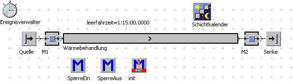 ein Beispiel zur Methode berechneArbeitsdauer des Schichtkalender-Objektes. In einem festen Zeitabstand zum Schichtende (Leerfahrzeit) wird der Eingang einer Anlage gesperrt.