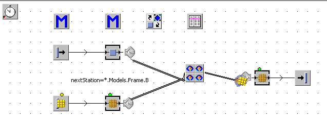 Das Beispiel zeigt eine Möglichkeit, das Ausgangsverhalten Teil wegtragen mit einer (empirischen) Wahrscheinlichkeit zu kombinieren (der Werker entlädt die Maschinen mit einer Verteilung von 70%/30%).