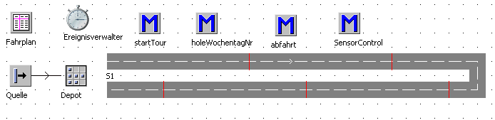 Ein Fahrzeug fährt nach einem festen Fahrplan Haltestellen ab.
