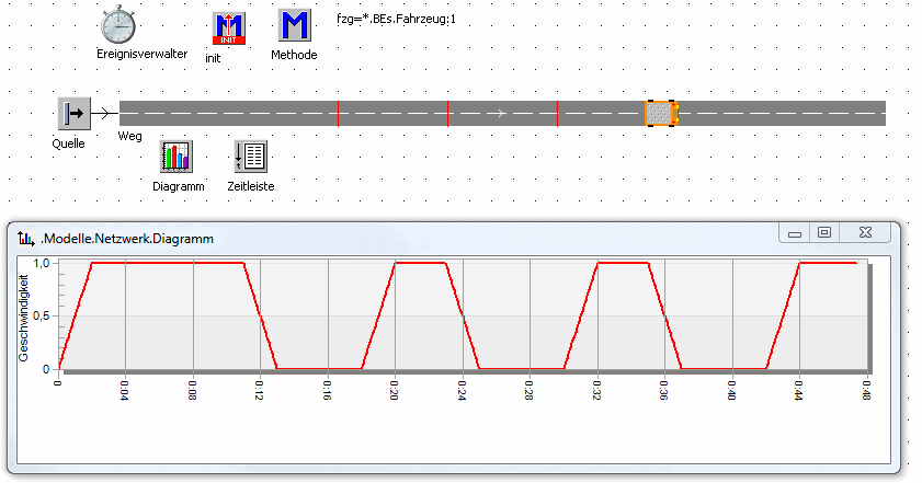 Diese Beispiel zeigt die Arbeit mit der Beschleunigung des Fahrzeugs: abbremsen, bis die Geschwindigkeit 0 ist, 5 Sekunden warten, dann bis zur Ausgangsgeschindigkeit wieder beschleunigen...
