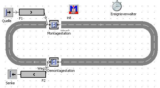 Das Beispiel zeigt die Beladung eines Fahrzeugs mit Hilfe der Montagestation und das Abladen des Fahrzeugs mit der Demontagestation.