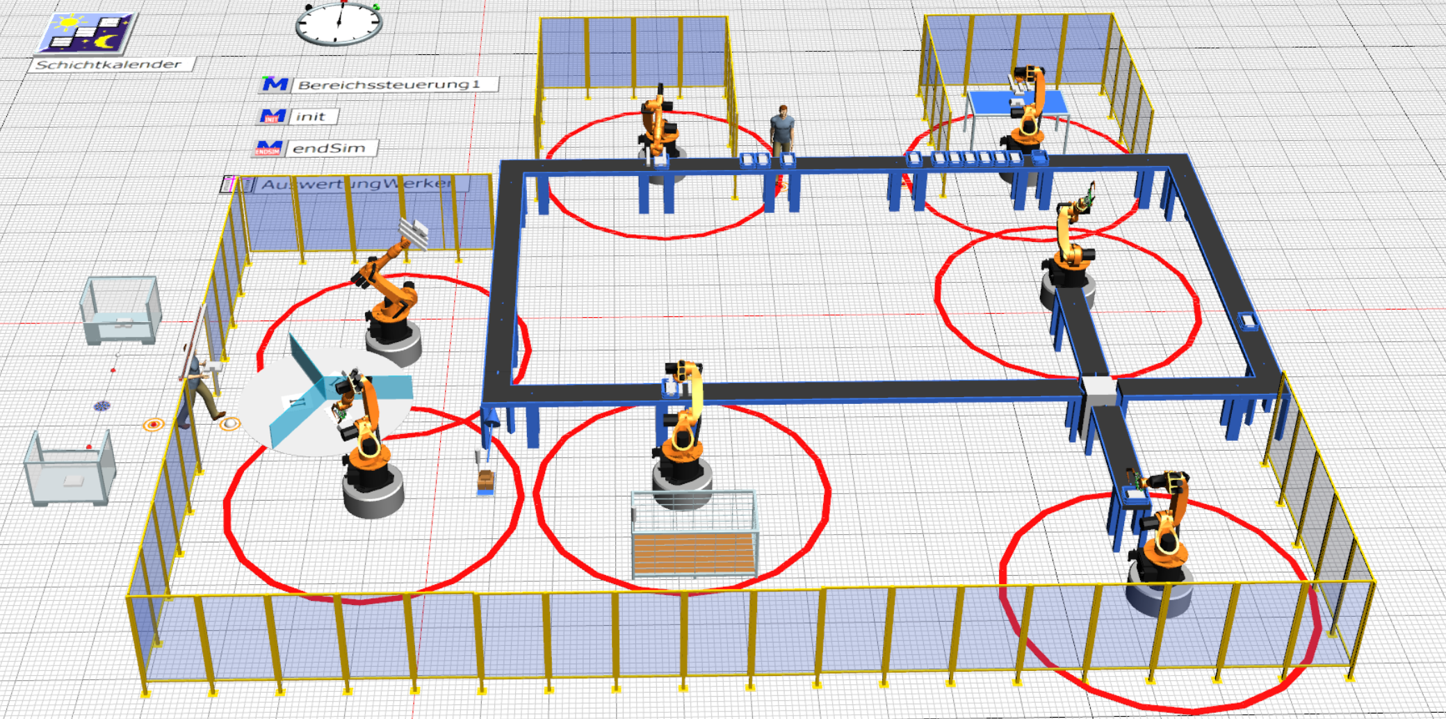 Das ist ein Schulungsbeispiel! Der Roboter ist auf der Basis einer Parallelstation, der Werker auf Basis des FTF modelliert.