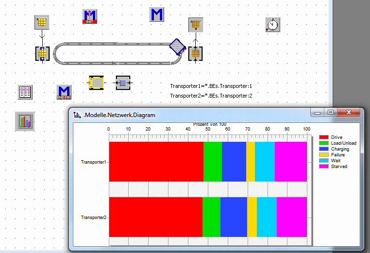 shows the battery behavior of the transporter (consumption, charging) and battery statistics