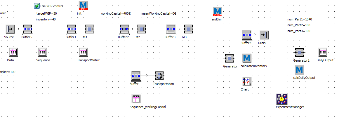this is a SimTalk training example; how to program the control for job shop production systems; bin transport; WIP control