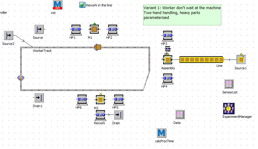 this is a SimTalk training example; how to model single part flow productions; the worker is modeled with transporter