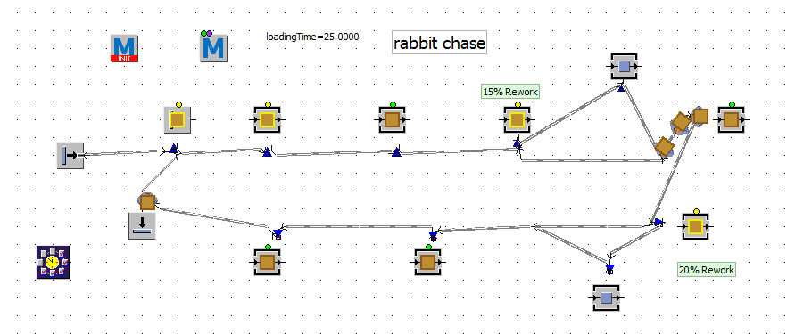 several worker follow each other in a "U" shape production system; realized using transporter and tracks