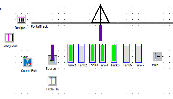 a portal crane transports charges of material from one tank to the next based on recipes (e.g. e-coating); in each step of the recipe multiple destinations are possible. Look for controls in the tanks and the portal track.