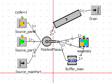 model assembly processes with PickAndPlace robots; this example uses a cycle control (exit control of the sources) and the exit strategy MU-attribute (attribute previousLocation)