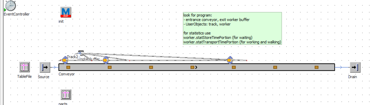 model assembly processes where the parts are located on a shifting conveyor; the model is based on transporters that create its own tracks dynamically