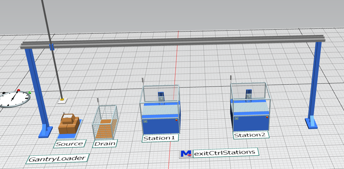 this example uses the Plant Simulation gantry loader library; parallel processing, I loader, single gripper; for programming see exit control of source and exit control of stations