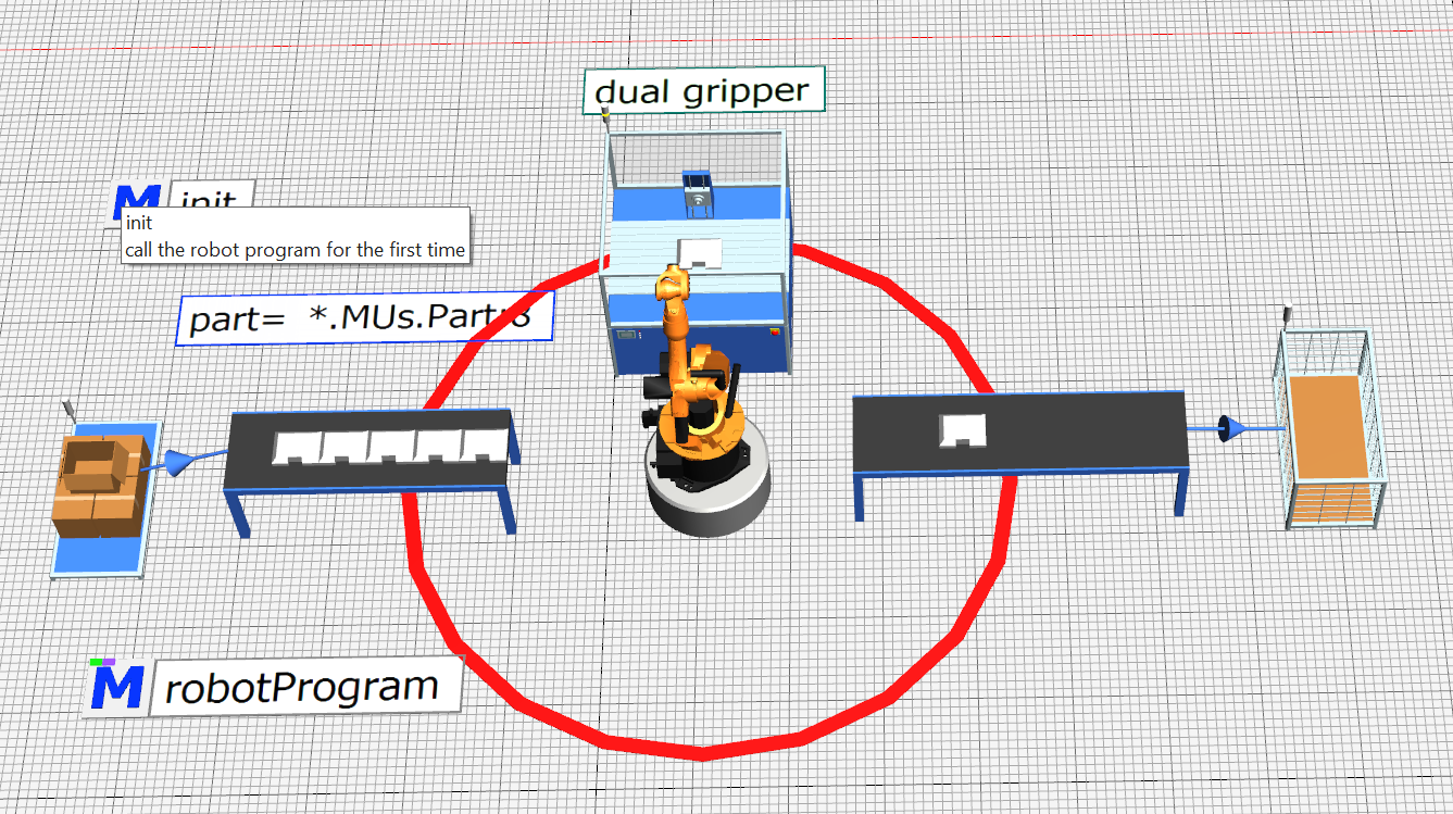 load and unload machines using a dual gripper (joints and poses), base of the robot is ParallelProc